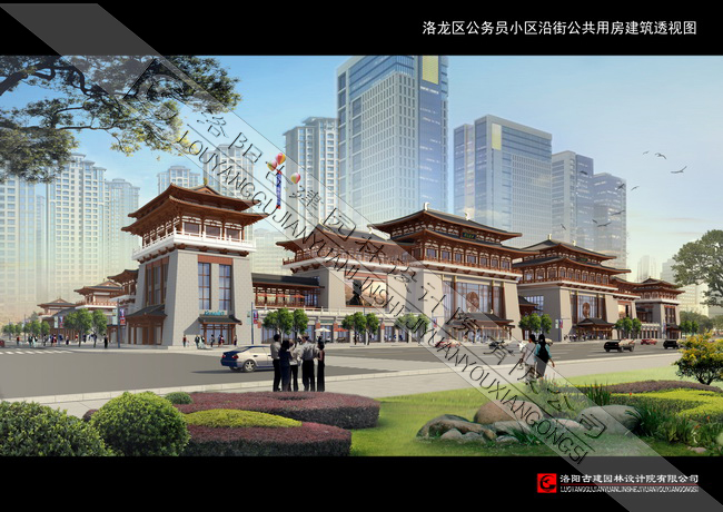 洛陽市洛龍區(qū)公務員小區(qū)沿龍門大道建筑為仿唐風墩臺式建筑群,南北長110米,東西寬40多米,高四層局部五層。唐代建筑規(guī)模宏大,氣勢磅礴,形體俊美,莊重大方,整齊而不呆板,華美而不纖巧,舒展而不張揚,古樸卻富有活力,建筑藝術加工和結構的完美統(tǒng)一,斗拱的結構、柱子的形象、梁的加工等都達到了力與美的統(tǒng)一。而色調簡潔明快,屋頂舒展平遠,門窗樸實無華,給人莊重,大方的印象。